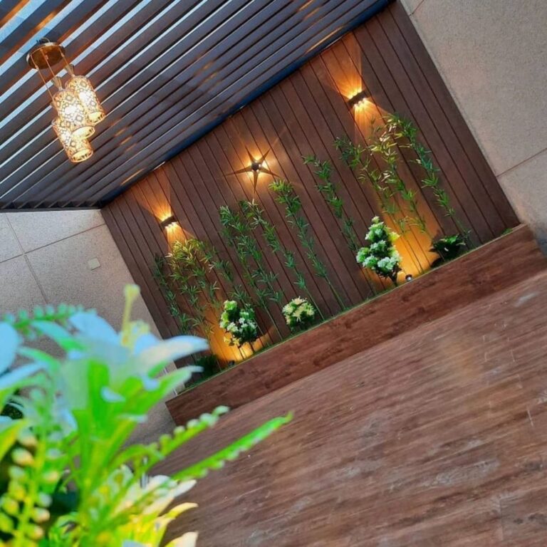 الجمع بين المظلة والخشب الطبيعي مع النباتات المتسلقة.