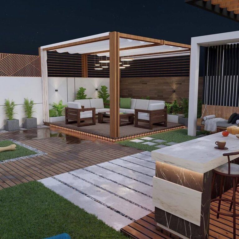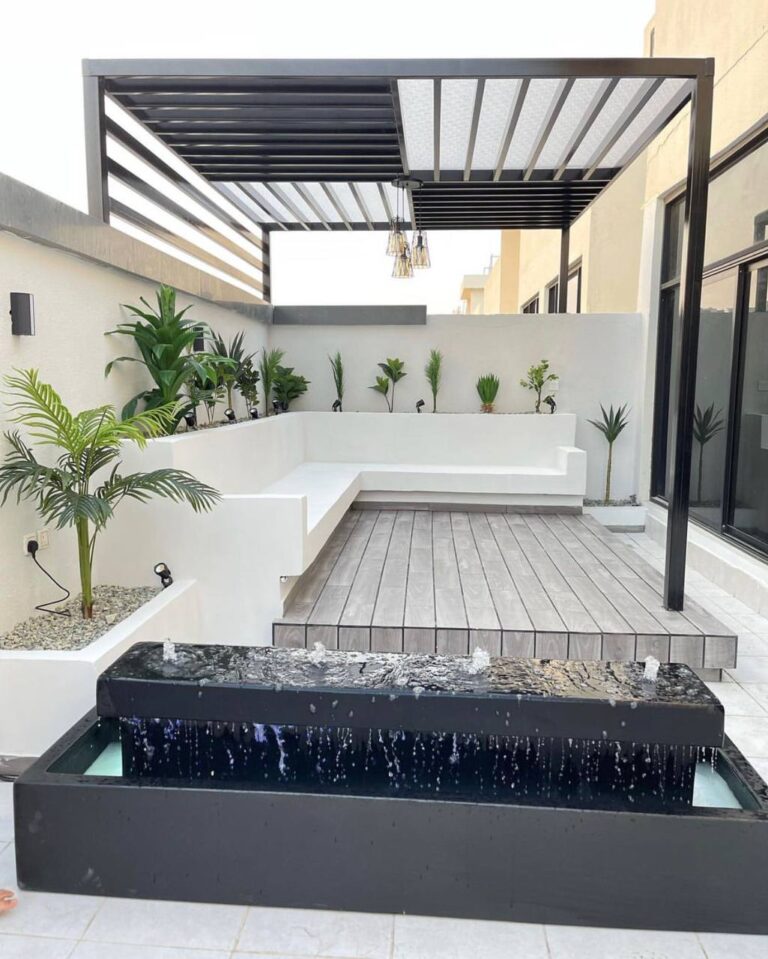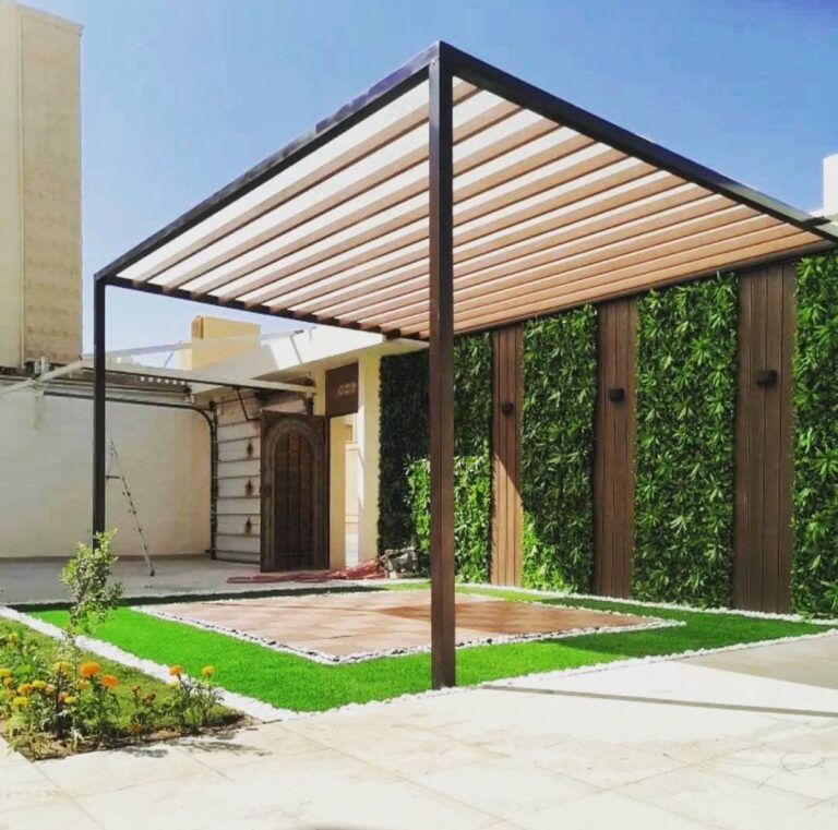 مظلات خشبية (برجولات): لمسة طبيعية دافئة مع إمكانية الدمج مع النباتات المتسلقة.
