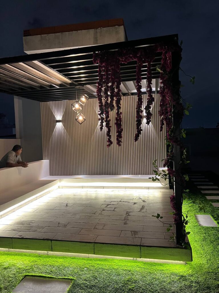 دمج الإضاءة المخفية داخل المظلة لجو ليلي دافئ.